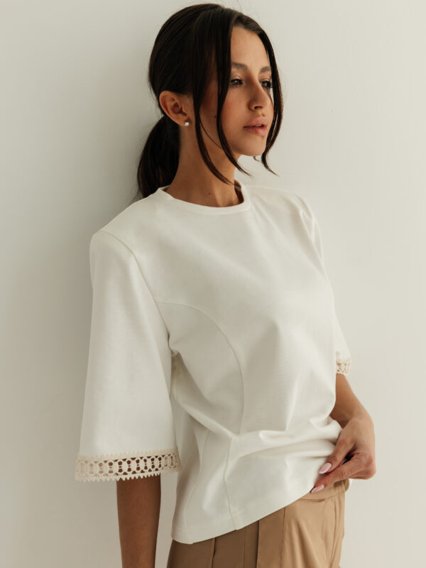 Jacqueline to połączenie klasyki z elegancją. Wygodny i nietuzinkowy t-shirt z miękkiej bawełny to idealna propozycja dla kobiet ceniących wygodę i styl. T-shirt na poduszkach dopinanych na zatrzaski. Rękaw do łokcia z ozdobną bawełnianą taśmą.