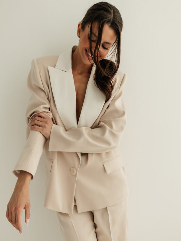 Uszyta z przepięknej tkaniny w kolorze beżowym, kontrastowe klapki w kolorze ecru nadają świeżego i wizytowego looku.