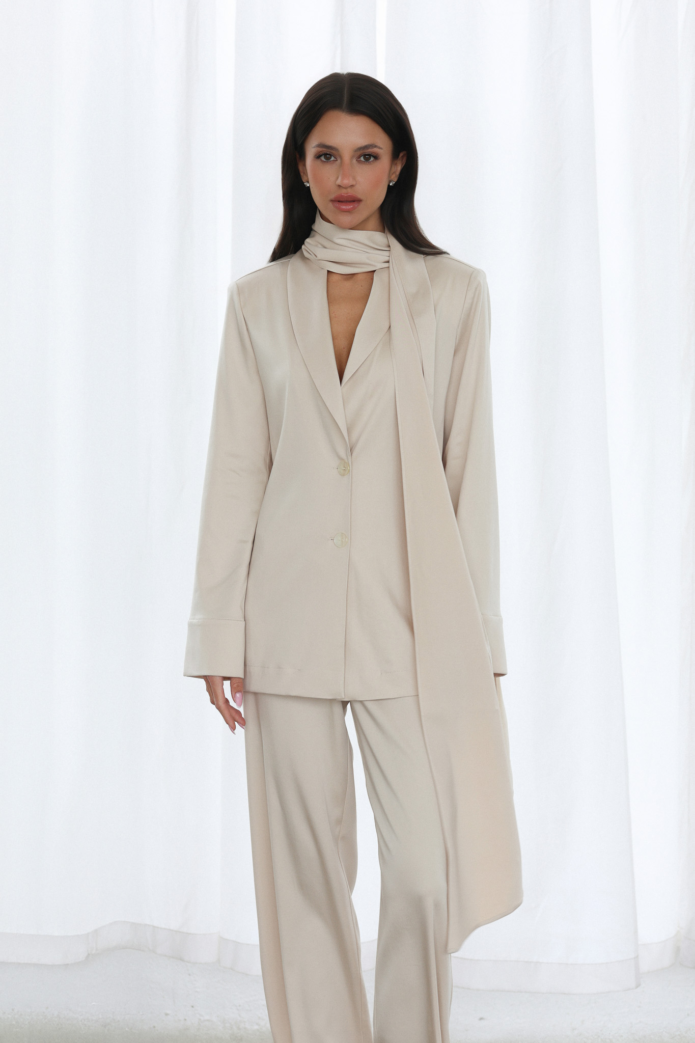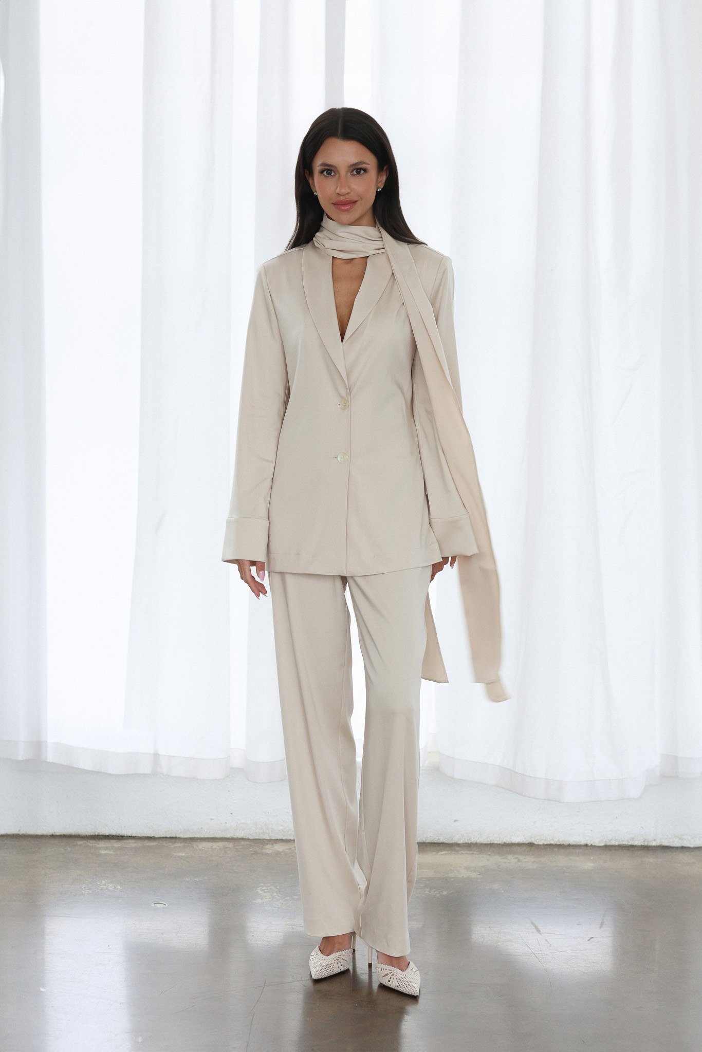 W skład zestawu wchodzi klasyczna marynarka, spodnie o prostym kroju oraz efektowny, długi szal, który nadaje stylizacji wyjątkowego charakteru.