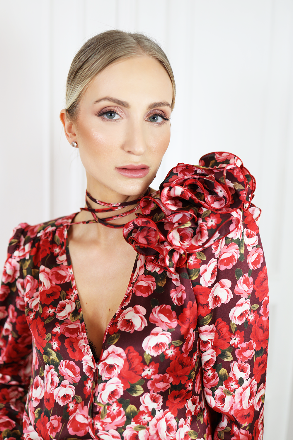 CHARLOTTE rose posiada przepiękne wiązanie na szyi z ozdobnym kwiatem, co nadaje bluzce kobiecego look’u.