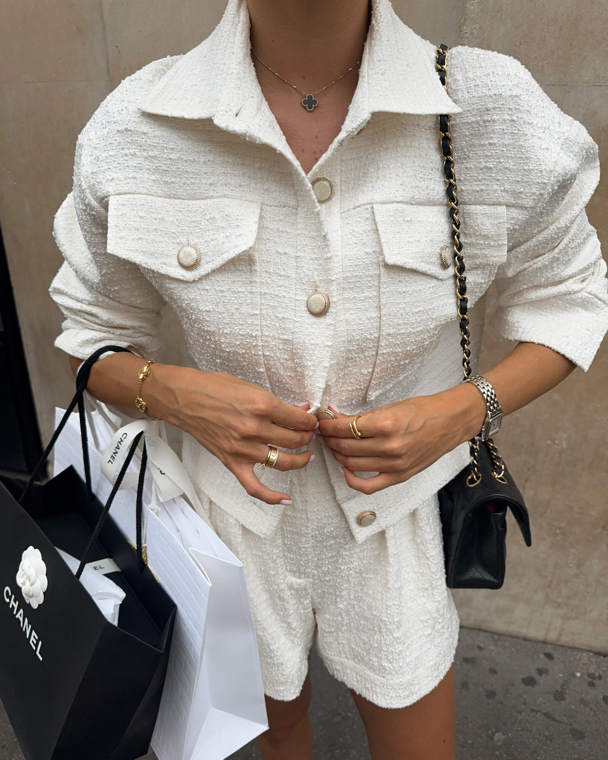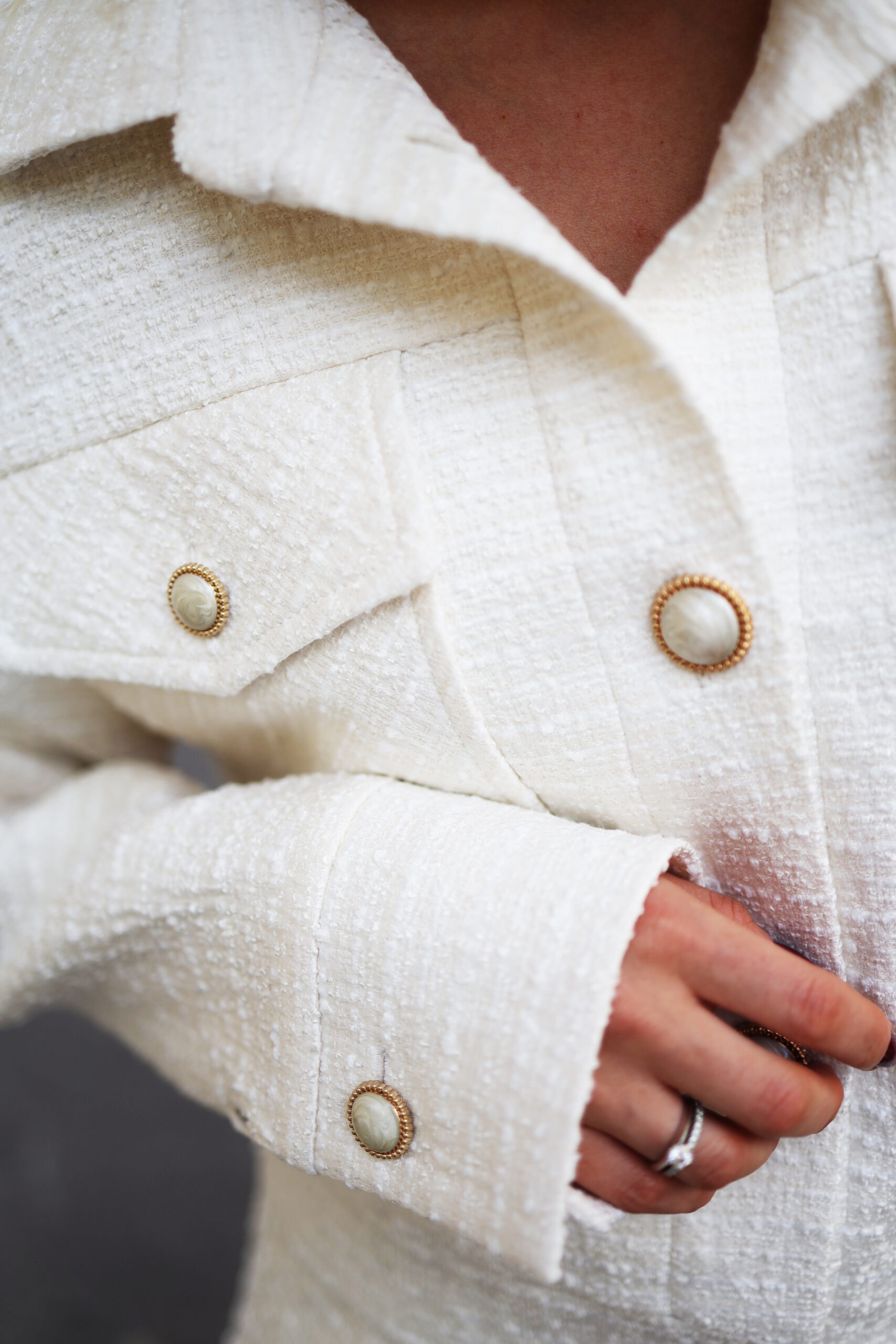 Krótka kurtka a’la bomberka z przepięknej tkaniny typu chanel to kolejna propozycja z najnowszej kolekcji J/Z 2024/2025. Zapinana na guziki, obniżone ramiona nadadają luźnego looku.