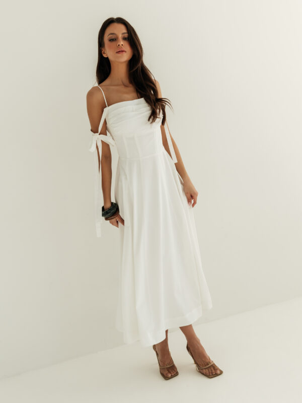 Model ma dopasowany gorset z regulowanymi ramiączkami dodatkowo wiązanymi na kokardkę taśmami.